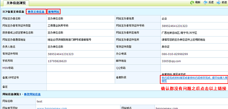 可以查看已经提交的备案的网站所有者信息、新增网站等。现在备案阶段是, 用户确认填写完成,等待审核
